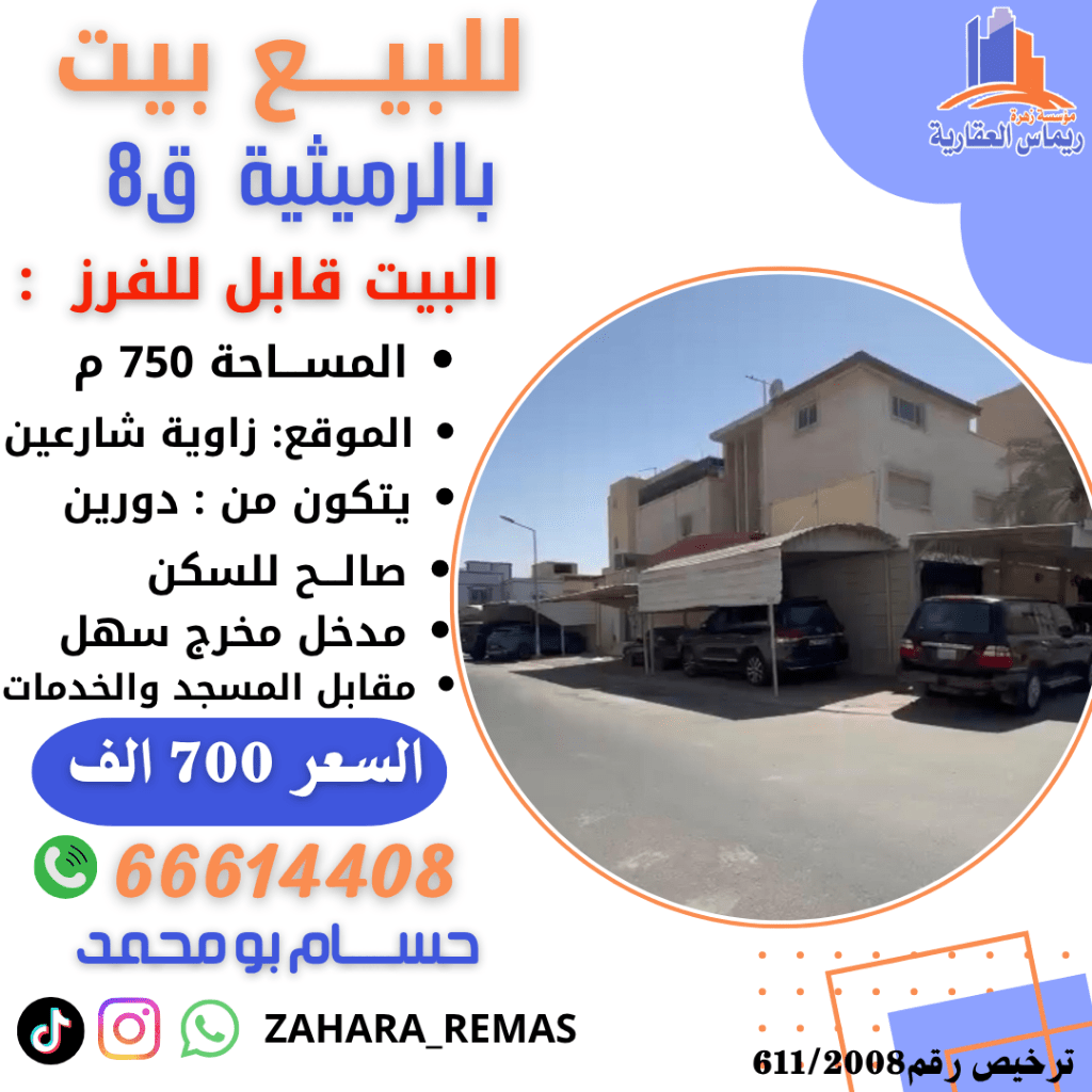 For sale, a villa in Al-Rumaithiya with an area of 750 square meters. The location is at the corner of two streets before the sorting area. The house consists of two floors and is suitable for living. It is close to the cooperative society branch and the mosque. The price is 700,000.