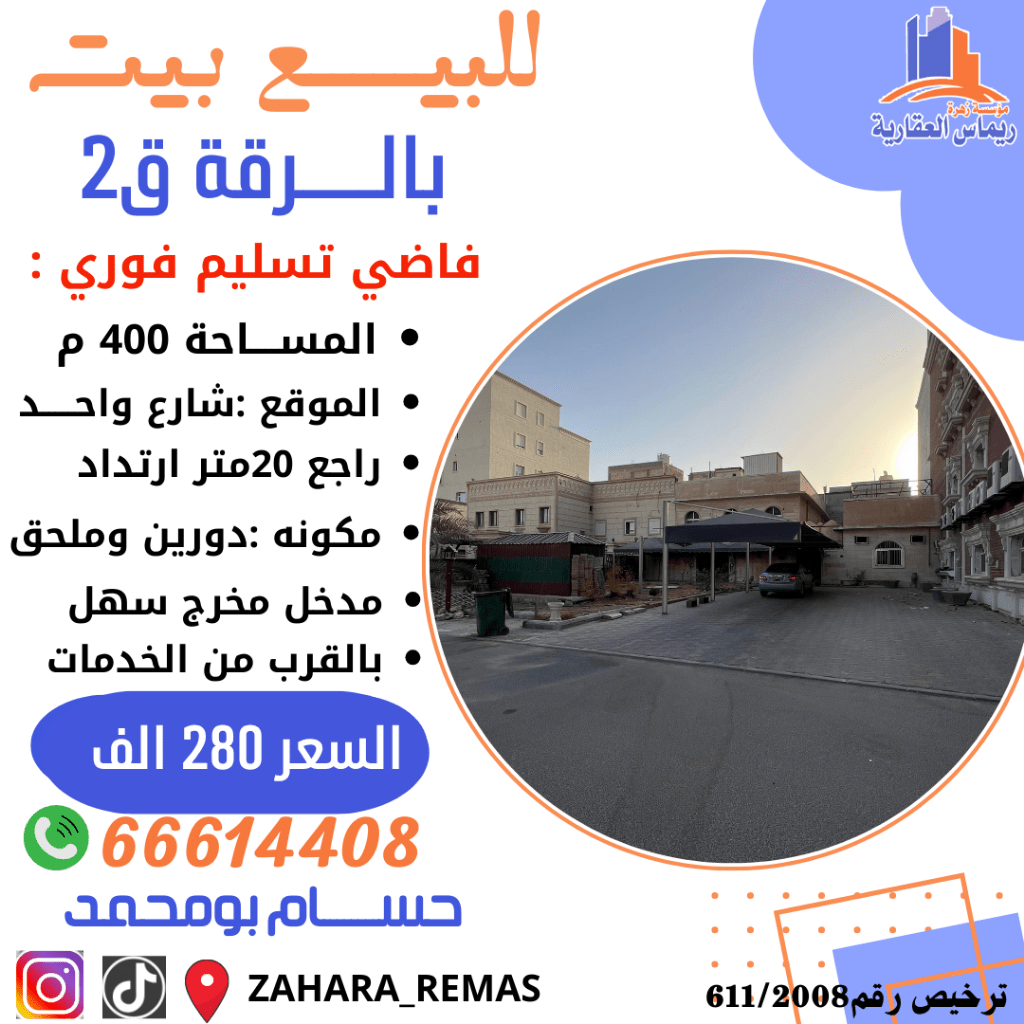 For sale: a house in Al-Raqqa, C2, vacant with immediate delivery. The area is 400 square meters. The location is on a single street. Setback of 20 meters, consisting of two floors and an annex, easy entrance and exit, near services. Price 280,000 Kuwaiti dinars.