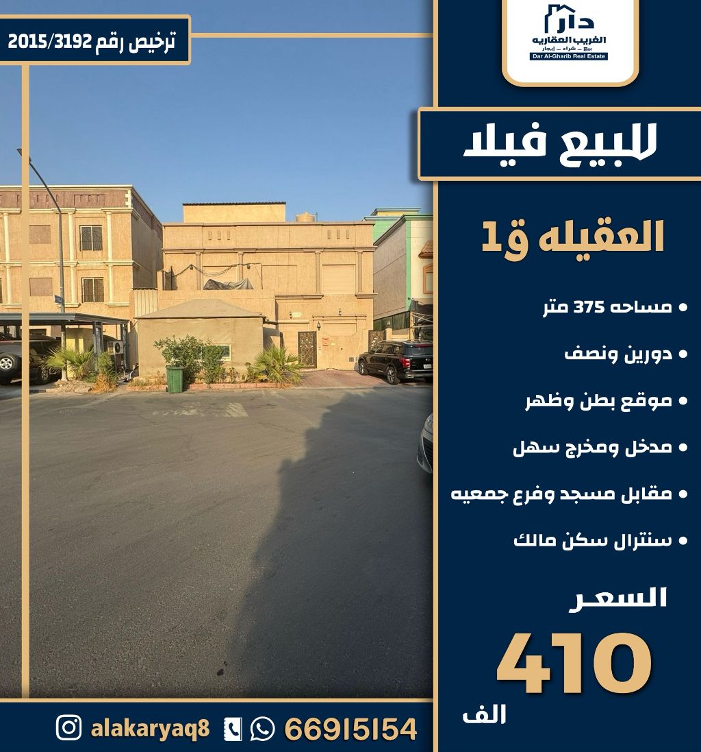 For sale, a villa in Al Aqaila with an area of 375 square meters, located on a corner plot with two and a half floors, owner-occupied, central air conditioning, opposite the mosque and a branch of Al Ahli Bank, easy access. Price: 410,000 KWD.