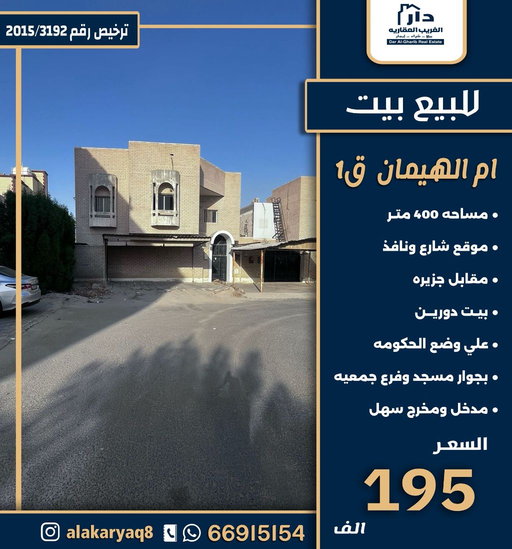For sale, a house in Ali Sabah Al-Salem, Area 1, with an area of 400 square meters, located on a street with a window opposite an island. It consists of two floors in government condition, next to a mosque and a cooperative society branch. Price: 195,000 KWD.