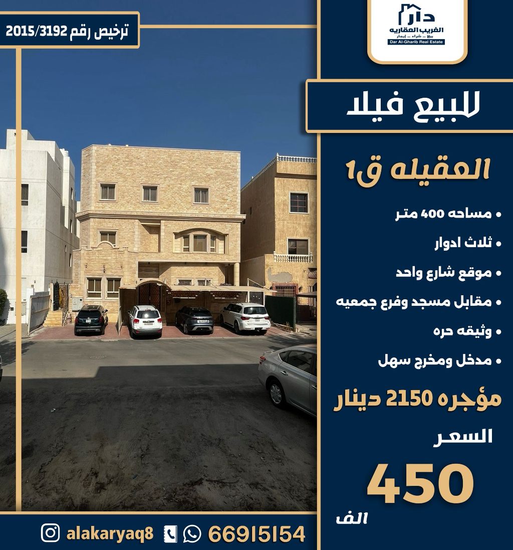 For sale: A villa in Aqaila, Phase 1, with an area of 400 square meters, three floors, located on a one-way street opposite the mosque and a cooperative branch, with easy access, currently rented for 2150 dinars. Price: 450,000 dinars.