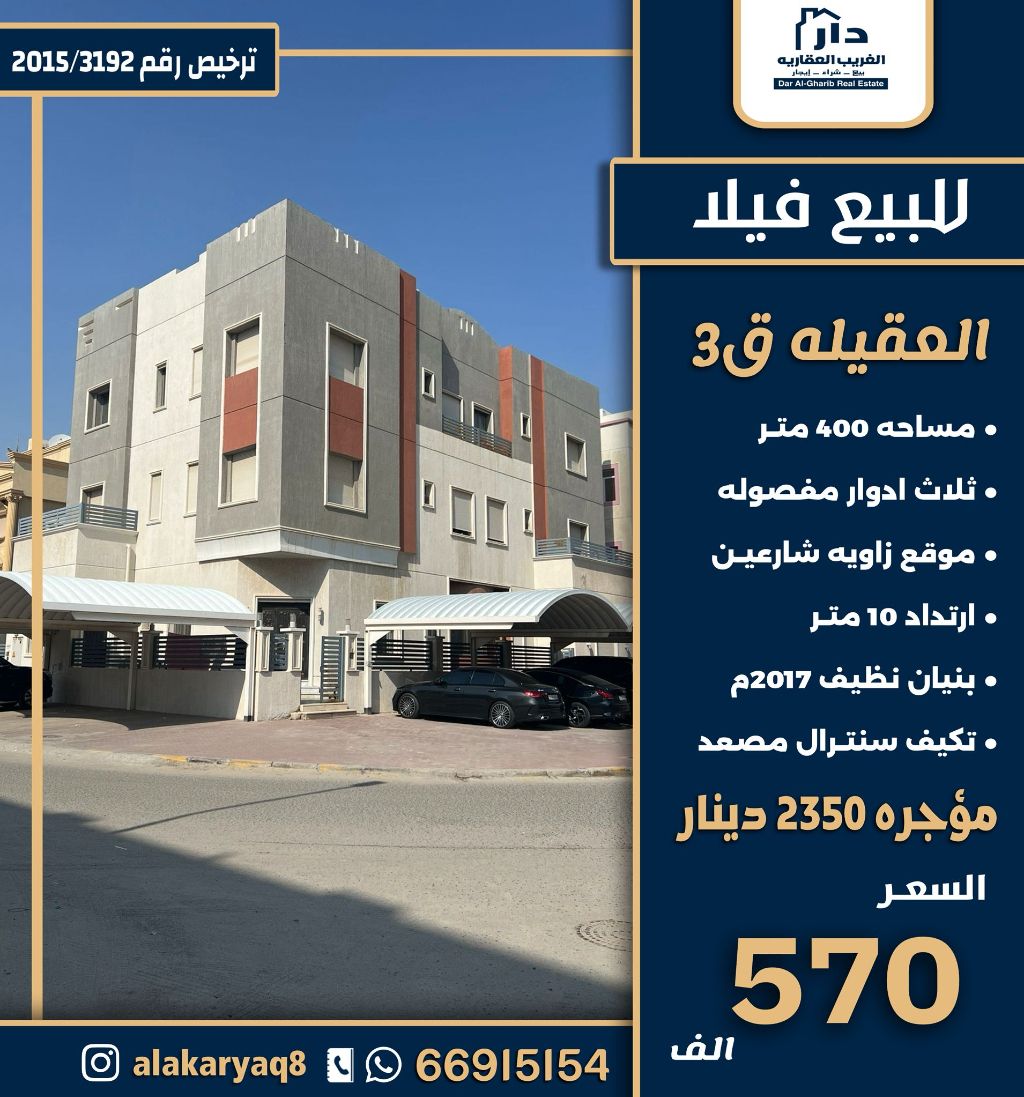 For sale: A villa in Al Aqaila with an area of 400 square meters, consisting of three separate floors, located on a corner with two streets and a 10-meter setback. The building is clean and was constructed in 2017, featuring central air conditioning and an elevator. It is currently rented for 2350 dinars. The price is 570,000 dinars.
