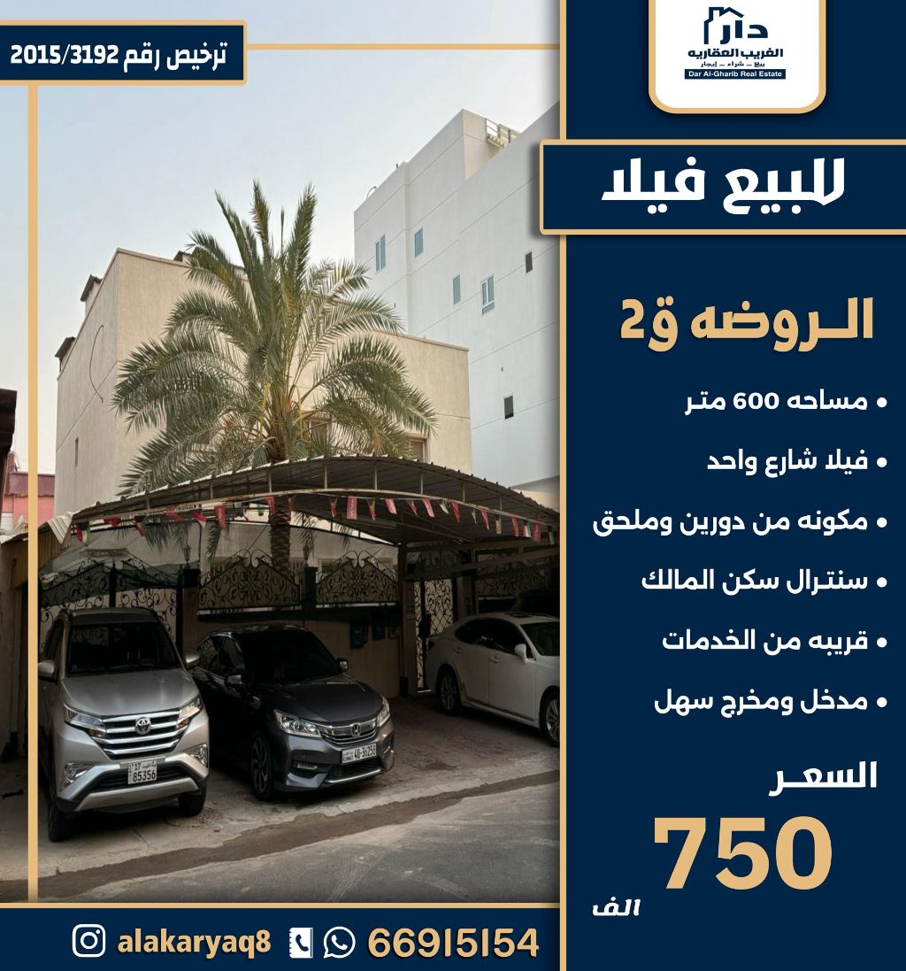 For sale: A house in Al Rawda, Area 2, with an area of 600 square meters. The house is on a one-way street, has two floors and an annex, central air conditioning, and was occupied by the owner. It is near services with easy access. Price: 750,000 KWD.
