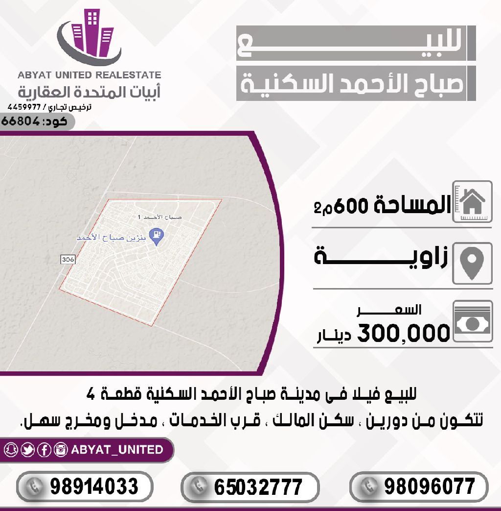 For sale: A villa in Sabah Al-Ahmad Residential City, Plot 4, corner location. Area: 600 sqm. It consists of two floors, owner-occupied, near services, with easy access. For inquiries, call Mobile 1, Mobile 2, Mobile 3. Price: 300,000 Kuwaiti Dinars. Code: 66804.