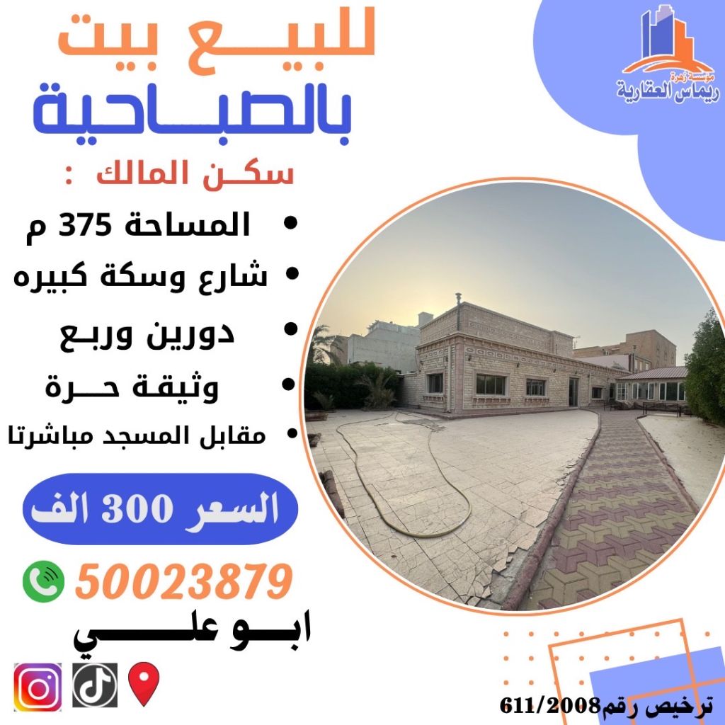 For sale: a house in Al-Sabahiya with an area of 375 square meters, consisting of two and a quarter floors, fully finished, owner-occupied, with a freehold title. The location is on a street and a main road directly opposite a mosque, with easy access and exit. The price is 300,000, and the asking price is 290,000.