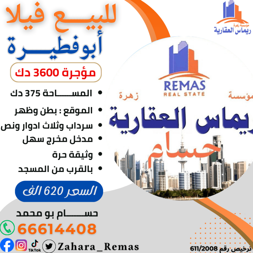 For sale: An investment villa in Abu Fatira, with an area of 375 square meters. The location is front and back on the main street. It consists of a basement, three floors, and a half, with excellent finishing. Easy entrance and exit, near the mosque and services. Monthly income is 3600. Price is 620 thousand.