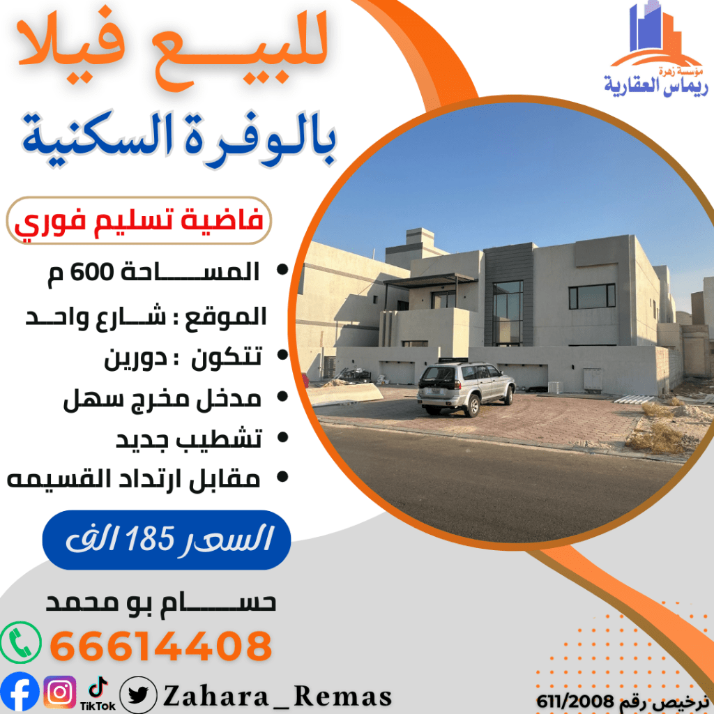 For sale, a villa in Al Wafra residential area, vacant and immediate delivery. Area 600 square meters. Location: Street One, opposite the plot setback. It consists of two floors, with easy entrance and exit. Price: 185,000 Kuwaiti dinars.