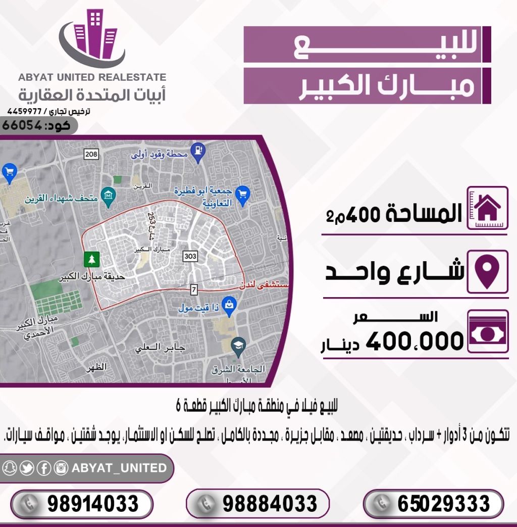 For sale, a villa in the Mubarak Al-Kabeer area, Block 6, located on a single street, 400 square meters. It consists of 3 floors, a basement, two gardens, an elevator, opposite an island, fully renovated, suitable for living or investment. There are two apartments, parking spaces: Parking 1, Parking 2, Parking 3. Price: 400,000 dinars. Code number: 66054.