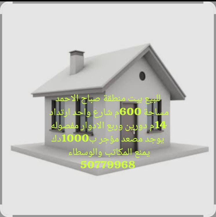 For sale: A house in Sabah Al-Ahmad. Area: 600 square meters. Location: One street with a 14-meter setback. Two floors and a quarter floor. Ground floor: 5 master bedrooms, a hall, and a kitchen. First floor: 5 master bedrooms, a hall, and a kitchen. The floors are rented to two families for 1000 Kuwaiti Dinars. The quarter floor is an apartment with a room, hall, bathroom, and kitchen (not rented) - price negotiable. Offices and brokers are prohibited.