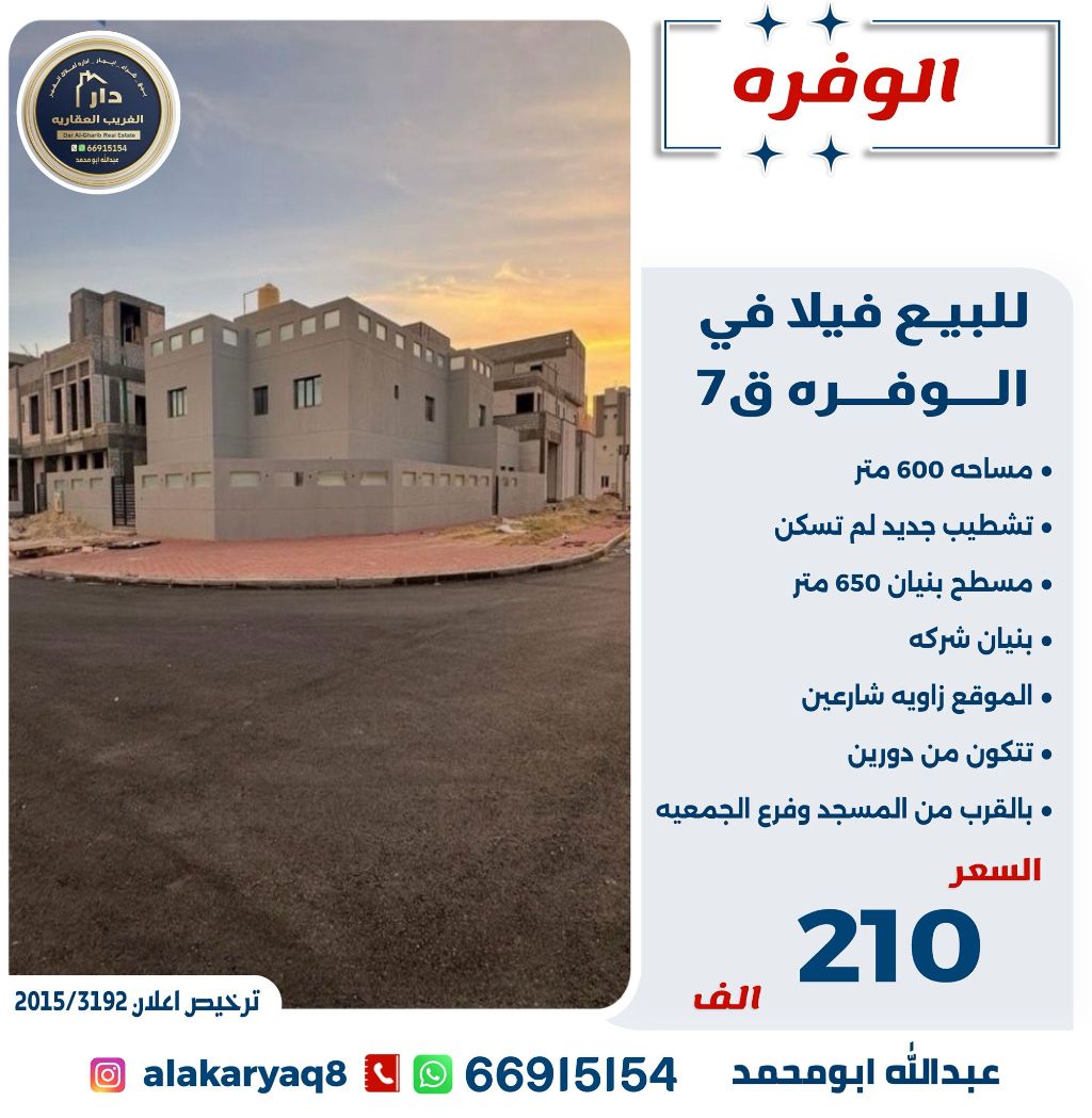 For sale, a villa in Al Wafra, Block 7, with an area of 600 square meters, new finishing, never lived in, built-up area of 650 square meters, built by Zawya Company, on two streets, consisting of two floors, near the mosque and a cooperative society branch, price 210,000 KWD.