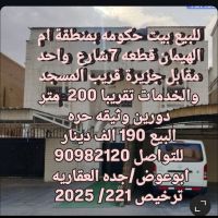 For sale: A government house in the Ali Sabah Al-Salem area, Block 7, on a one-way street opposite an island, near the mosque and services. Approximately 200 square meters, two floors, with a freehold title. Sale price: 190,000 Kuwaiti dinars. For contact: Abu Awad / Jeddah Real Estate, license number 221/2025.