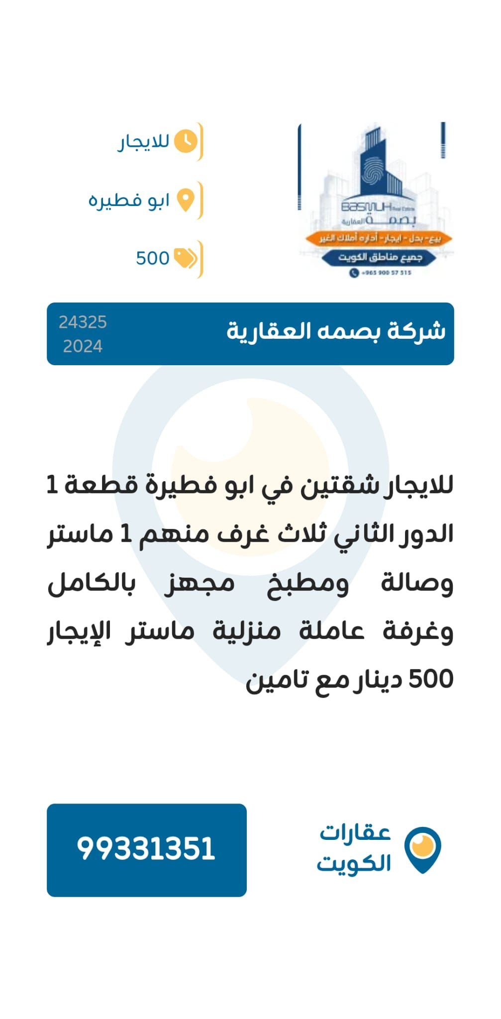 For rent: Two apartments in Abu Fatira, Piece 1, second floor. Each has three bedrooms (including one master), a living room, a fully equipped kitchen, and a maid's room. Rent is 500 dinars with a security deposit. Brokerage: Basma Real Estate, Real Estate - Kuwait. For rent in Abu Fatira, q8aqarcom.