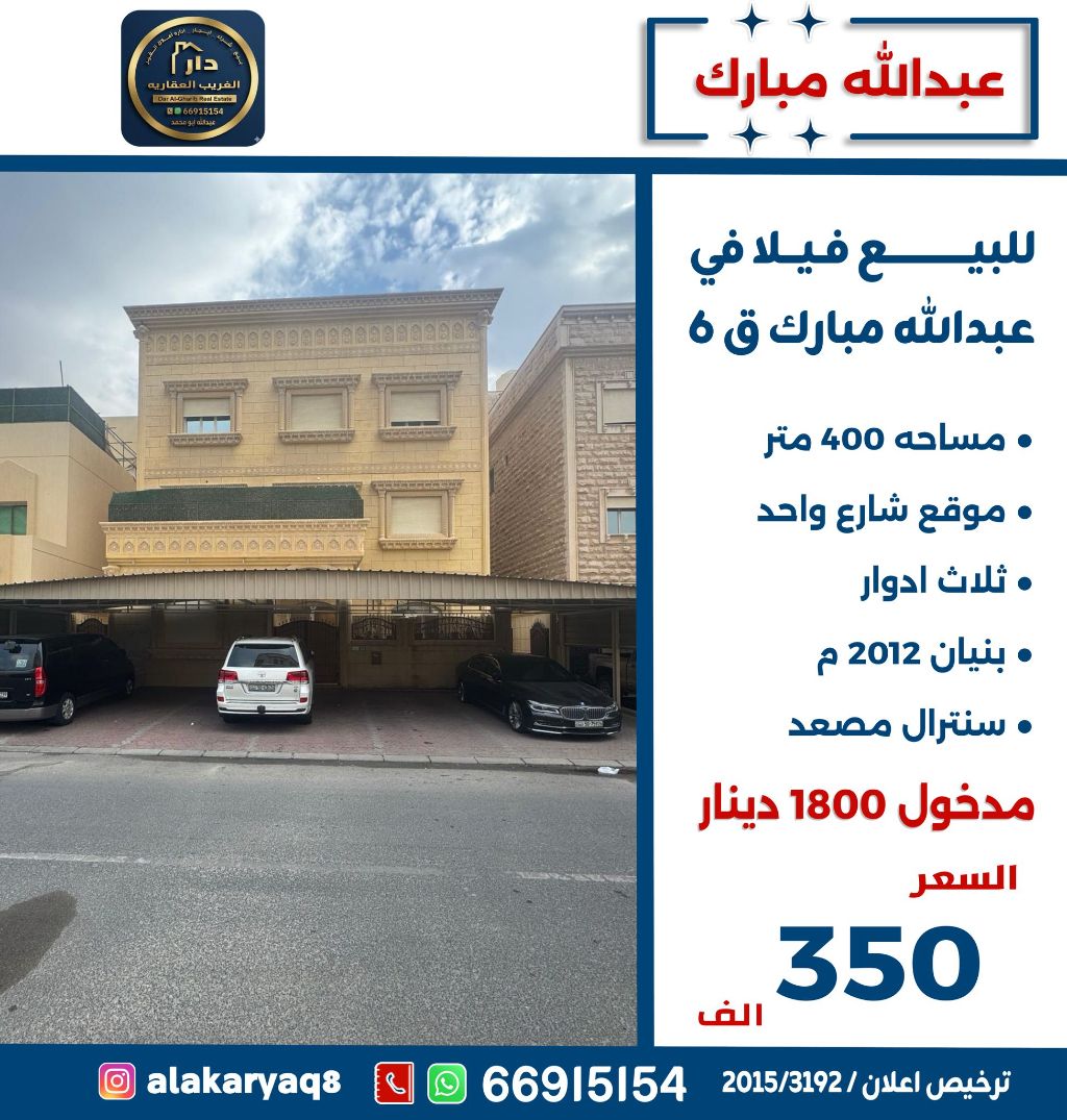 For sale, a villa in Abdullah Mubarak, Area 6, with an area of 400 square meters, located on a single street, three floors, built in 2012, central air conditioning, elevator, monthly income 1800 Kuwaiti Dinars, price 350,000 Kuwaiti Dinars.