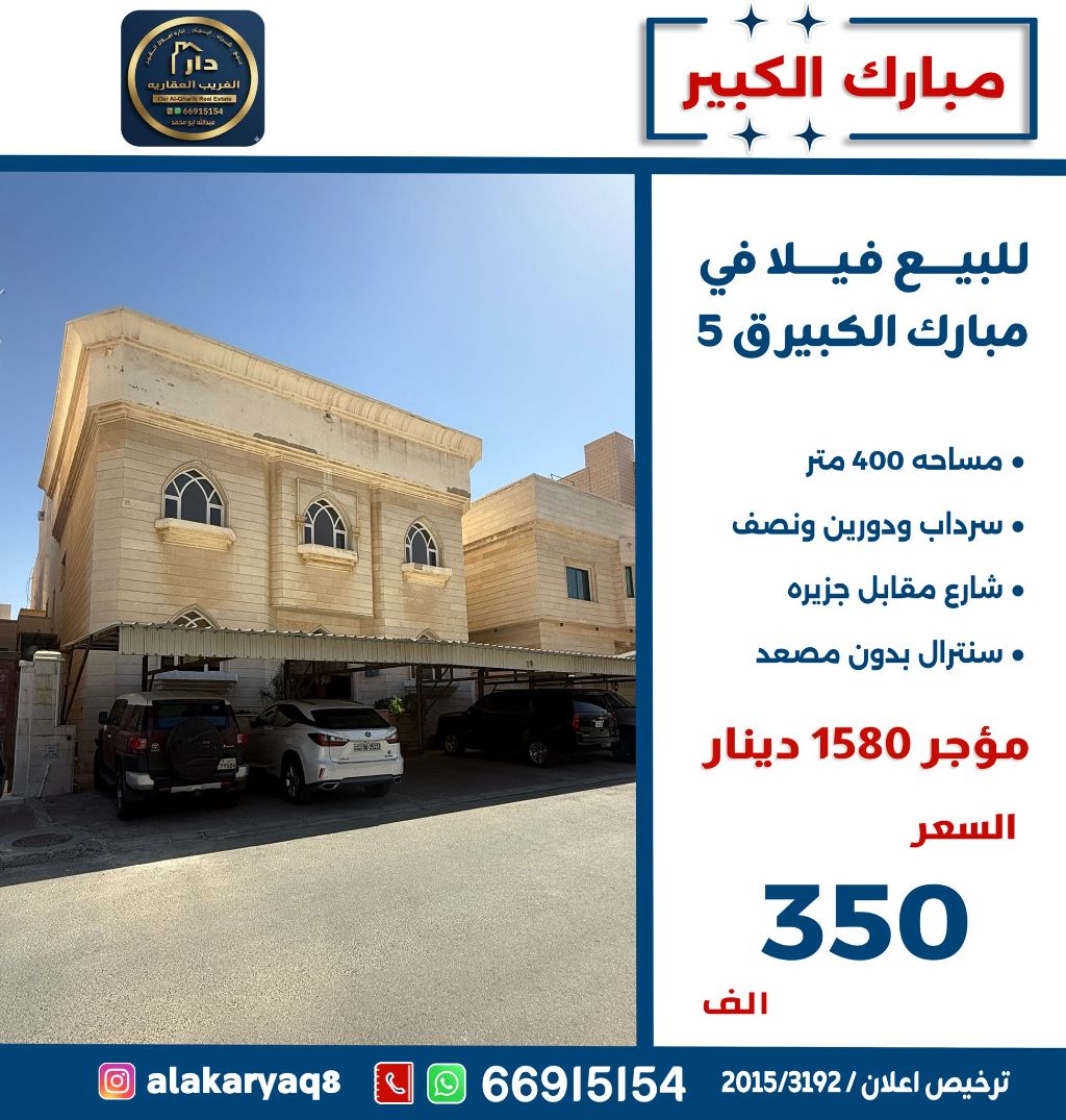 For sale: A villa in Mubarak Al-Kabeer, Area 5, with an area of 400 square meters. It includes a basement, two and a half floors, central air conditioning, no elevator, and a monthly income of 1580 Kuwaiti Dinars. The price is 350,000 Kuwaiti Dinars.