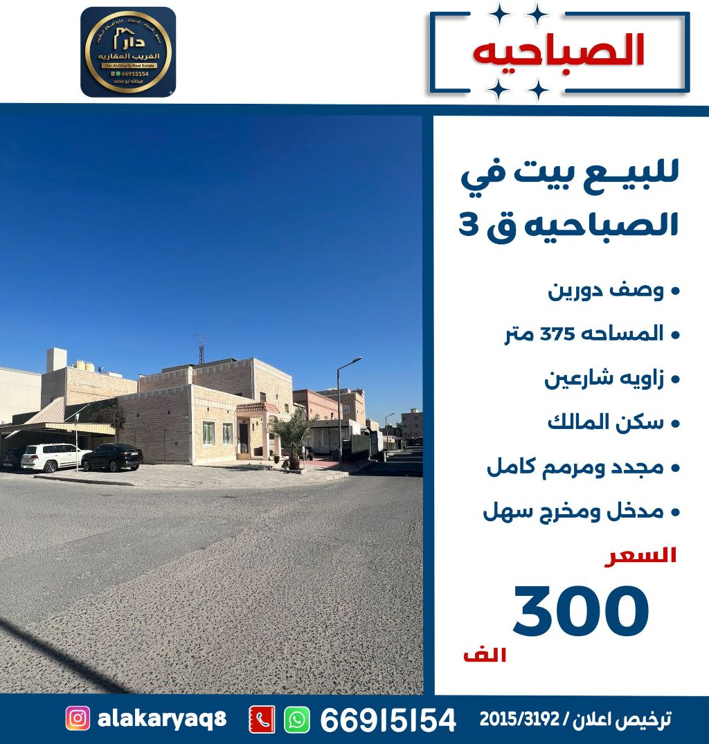 For sale: A house in Al-Sabahiya, Area 3, two floors, area 375 square meters, corner plot with two street fronts, owner-occupied, renovated and refurbished, easy access and exit, price 300,000 KWD.