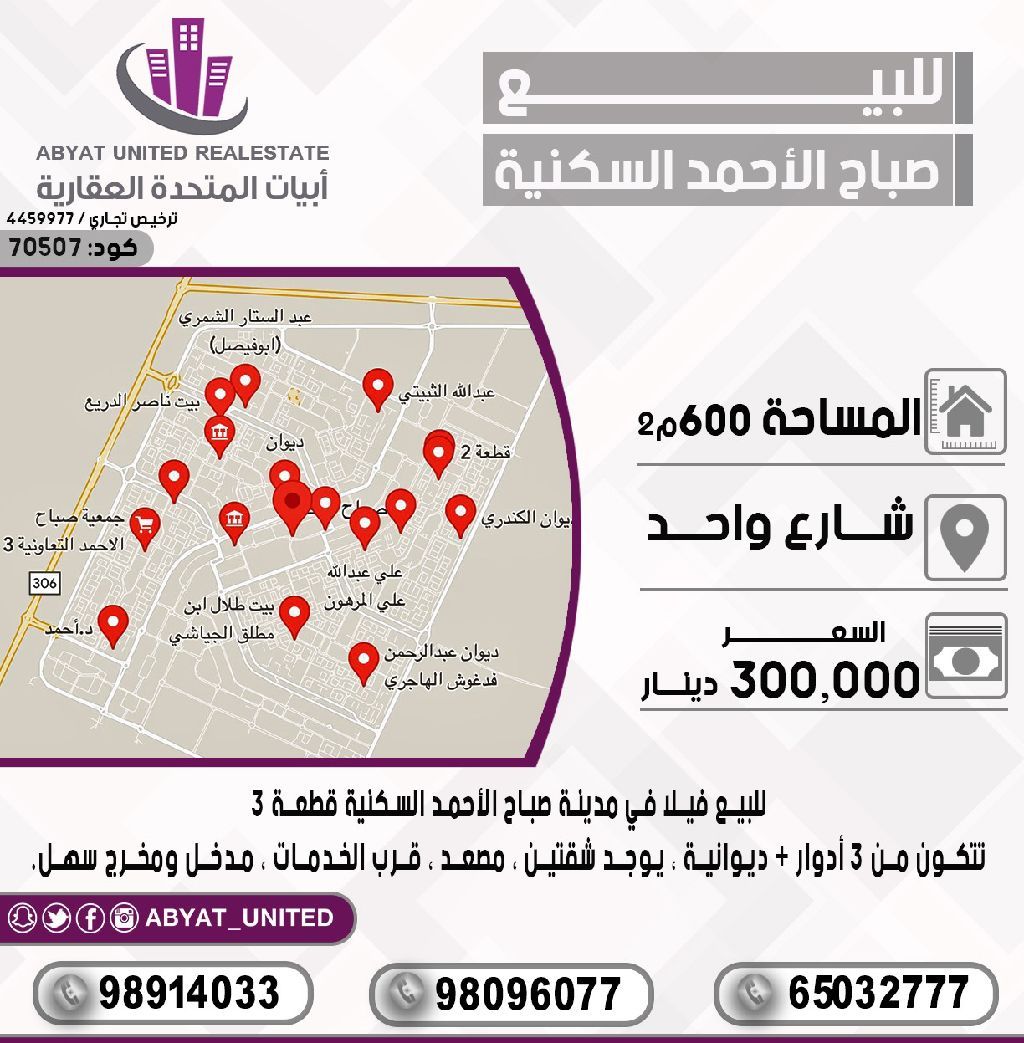For sale: A villa in Sabah Al-Ahmad Residential City, Plot 3, located on Street One. The area is 600 square meters, consisting of 3 floors, a diwaniya (reception area), includes two apartments, an elevator, close to services, with easy access. For inquiries, mobile numbers: 1, 2, 3. Price: 300,000 dinars. Code: 70507.