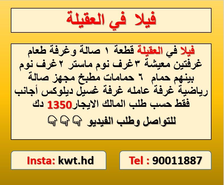فيلا في العقيلة، قطعة 1، تحتوي على صالة، غرفة طعام، غرفتين معيشة، 3 غرف نوم ماستر، غرفتي نوم بينهما حمام، 6 حمامات، مطبخ مجهز بالكامل، صالة رياضية، غرفة عاملة، غرفة غسيل، ديلوكس، للأجانب فقط حسب طلب المالك. الإيجار 1350 دينار كويتي. للتواصل وطلب الفيديو
