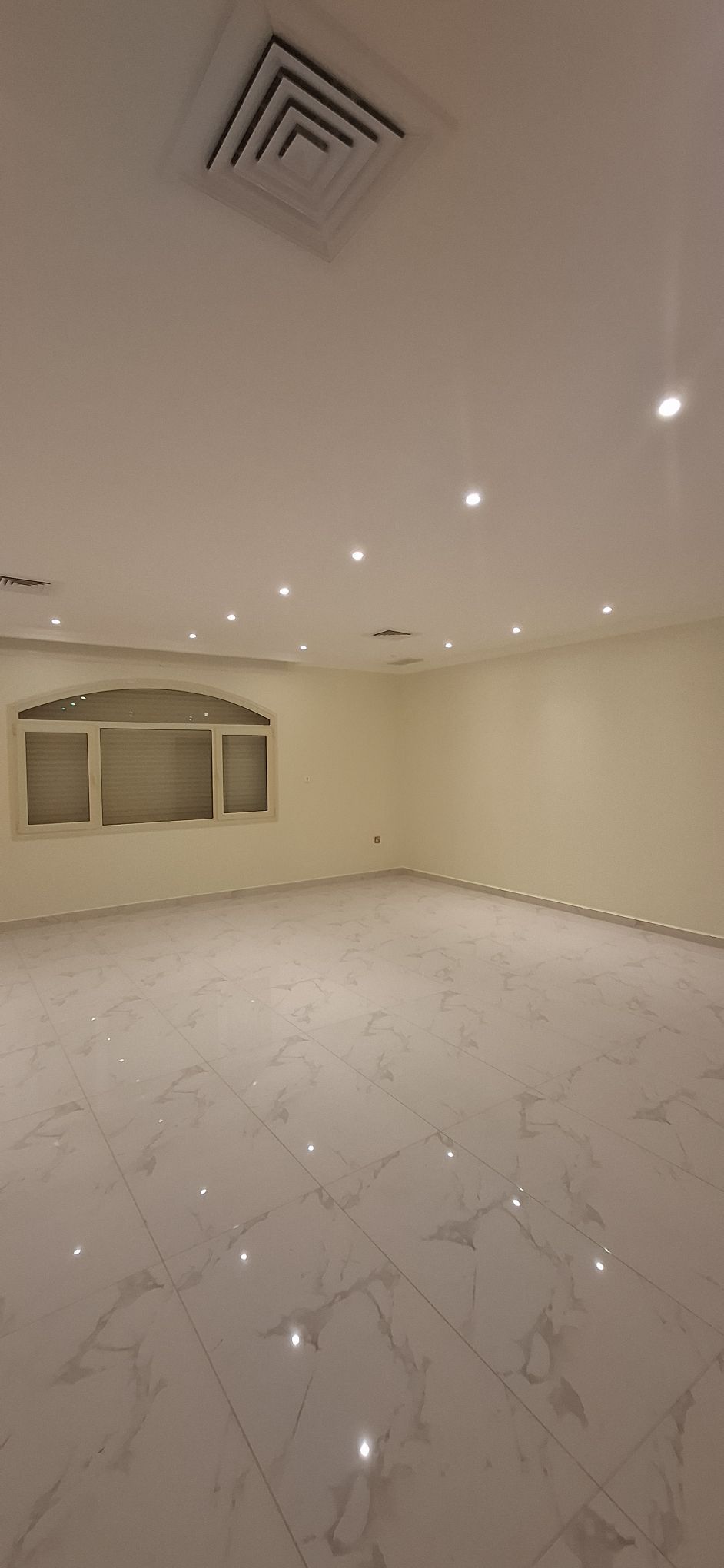 For rent, a villa in Abu Al Hasaniya with 3 floors and a basement. The first floor includes a hall, a guest bathroom with its laundry, two master bedrooms with their own bathrooms and closets, two bedrooms with a shared bathroom and their closets, a kitchen, a maid's room with its bathroom, and a laundry room. Additionally, there is a room for a driver or cook, or it can be used as a storage room with