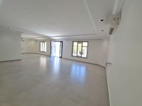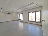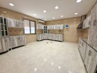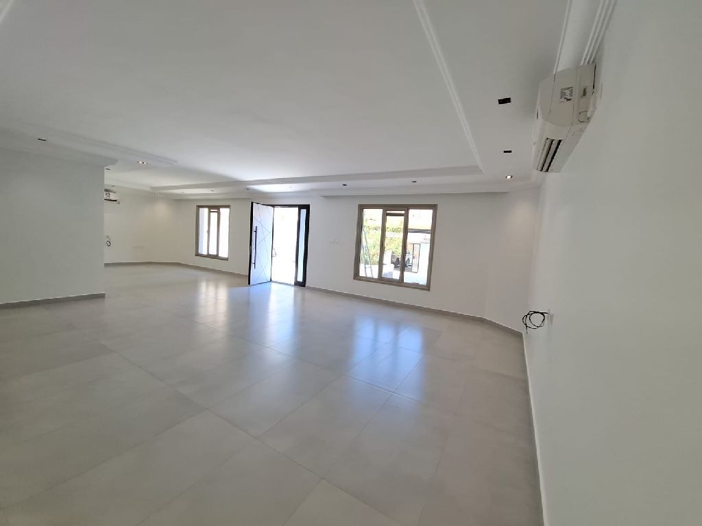 For rent, a new house in Abdullah Al-Mubarak with a staircase and air conditioning units. It consists of two floors: first and second, plus a ground floor. The ground floor includes a large kitchen, a driver's room with a bathroom, a bedroom with a bathroom, and a large hall that opens to a spacious courtyard suitable for a diwaniya. The first floor is similar, and the second floor has two apartments, each with three bedrooms (including a master bedroom), a hall, and two bathrooms. The roof is large and includes a maid's room with a bathroom. Rent is 1300 KD for Kuwaiti families.