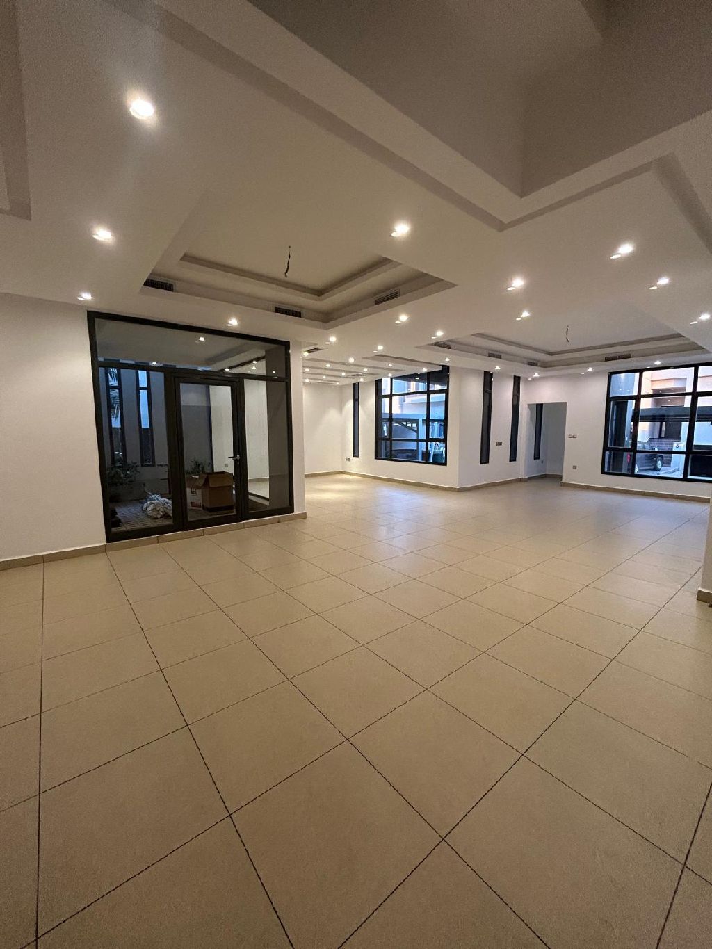 For rent: A complete ground floor apartment in Fintas, consisting of an external diwaniya with a bathroom, a large hall, an internal garden, 4 bedrooms (including 2 master bedrooms and 2 bedrooms sharing a bathroom), an internal garden, a maid's room with its own bathroom, a laundry room, a kitchen, an external diwaniya with a bathroom, and two shaded parking spaces. Price: 900 dinars. Brokers are prohibited.
