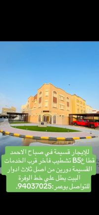 For rent: A two-story plot out of three stories in Sabah Al-Ahmad, consisting of a ground floor and first floor, corner location on two streets, second row from Al-Wafra line. Very luxurious finishing, close to all services. There is an isolated diwaniya near Al-Wafra line, the main cooperative, and schools. The plot has easy entrance and exit. Price: 1050 KWD including electricity and water. Includes elevator, shutters, and fully installed kitchen.