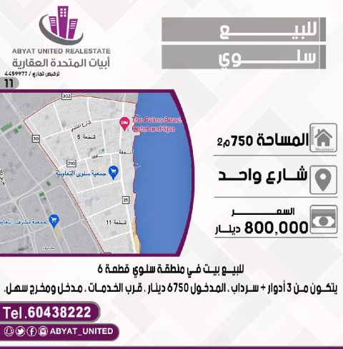 للبيع: بيت في منطقة سلوى، قطعة 6، يقع على شارع واحد. المساحة 750 متر مربع، ويتكون من 3 أدوار وسرداب. المدخول الشهري 6,750 دينار. قرب الخدمات ومدخل ومخرج سهل. للاستفسار، النقال رقم 1. السعر: 800,000 دينار. الكود: 11.