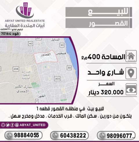 For sale: A house in the Al-Qusur area, Plot 1, with an area of 400 square meters. The location is on a single street, consisting of two floors, owner-occupied, near services, with easy access. For inquiries, contact Mobile 1, Mobile 2, Mobile 3. Price: 320,000 dinars. Code number: 70164.