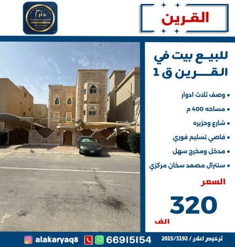 للبيع: بيت في القرين، منطقة 1، مساحة 400 متر مربع، ثلاث أدوار، مقابل شارع مقابل جزيرة فاضية، تسليم فوري، مدخل ومخرج سهل، سنترال، مصعد، سخان مركزي. السعر: 320,000 دينار كويتي.