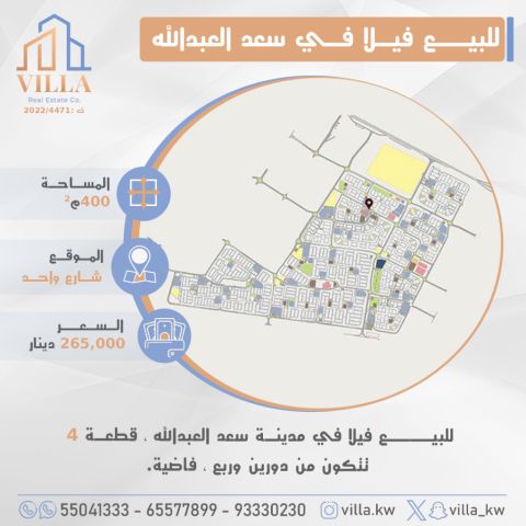 For sale, a villa in Saad Al-Abdullah City, Plot 4, area 400m, located on a single street, consisting of two and a quarter floors, vacant. Price 265,000 KD. For inquiries, mobile 1, mobile 2, mobile 3.