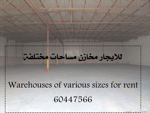 للإيجار: مخزن بميناء الشعيبة مساحة 2500 متر مربع و5000 متر مربع، وللإيجار: مخزن بالأحمدي مساحة 300 متر مربع و500 متر مربع و400 متر مربع، وسرداب بالشويخ مساحة 400 متر مربع، يصلح لكافة أنواع التخزين. تلفون.