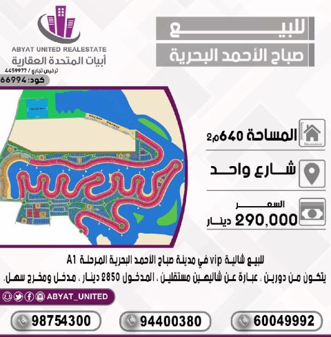 للبيع، شاليه استثماري في مدينة صباح الأحمد البحرية، قطاع سي، المرحلة الثالثة، بمساحة 619 متر مربع، بطن وظهر، نافذ على رأس الخور، بوجهة بحرية 39.5 متر، بإطلالة بحرية رائعة على امتداد كبير قابل للتقسيم إلى 4 شاليهات، كل شاليه يتكون من 3 أدوار وسرداب (حمام سباحة)، في كل شاليه 6 غرف نوم ماستر، 3 صالات، وديوان. سعر البيع 550,000 دينار كويتي.