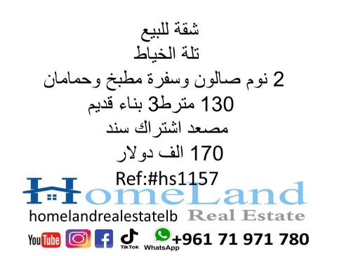 شقة للبيع تلة الخياط 2 نوم صالون وسفرة مطبخ وحمامان 130 متر ط 3 بناء قديم مصعد اشتراك سند 170 ألف دولار مكتب عقاري للتواصل تلفون