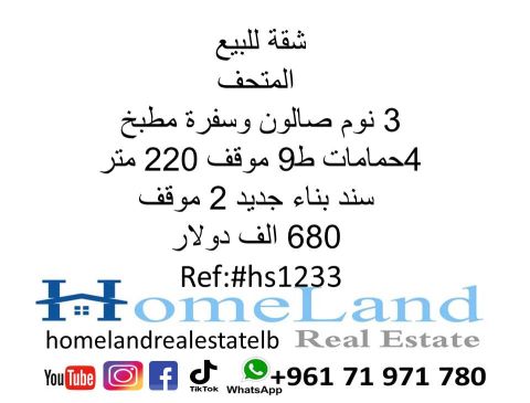 شقة للبيع المتحف 3 نوم صالون وسفرة مطبخ 4 حمامات ط 9 موقف 220 متر سند بناء جديد 2 موقف 680 ألف دولار مكتب عقاري للتواصل تلفون