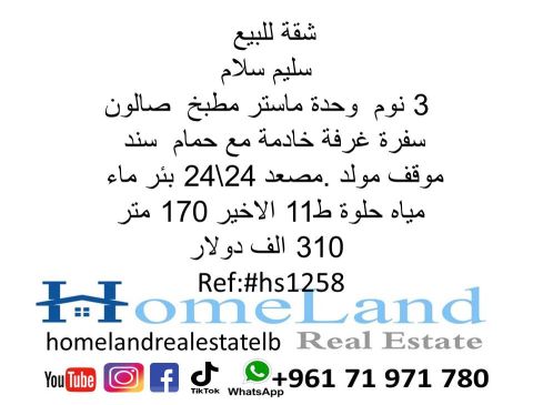 شقة للبيع سليم سلام 3 نوم وحدة ماستر مطبخ وصالون وسفرة وغرفة خادمة مع حمام سند موقف مولد مصعد 24 24 بئر ماء + مياه حلوة ط 11 الأخير 170 متر 310 ألف دولار مكتب عقاري للتواصل تلفون