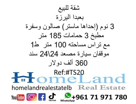 شقة للبيع بعبدا أليرزه 3 نوم (أحداها ماستر) صالون وسفرة مطبخ 3 حمامات 185 متر مع تراس مساحته 100 متر ط 1 موقفان سيارة مصعد 24 24 سند 360 ألف دولار مكتب عقاري للتواصل تلفون