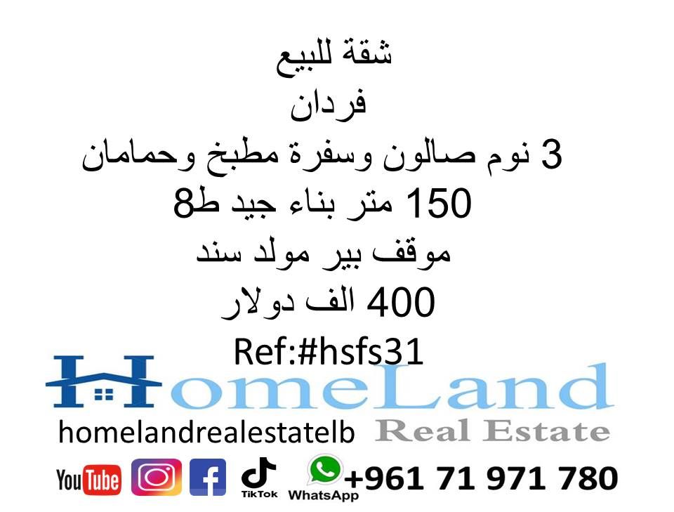 شقة للبيع فردان 3 نوم صالون وسفرة مطبخ وحمامان 150 متر بناء جيد ط 8 موقف بئر مولد سند 400 ألف دولار مكتب عقاري للتواصل تلفون