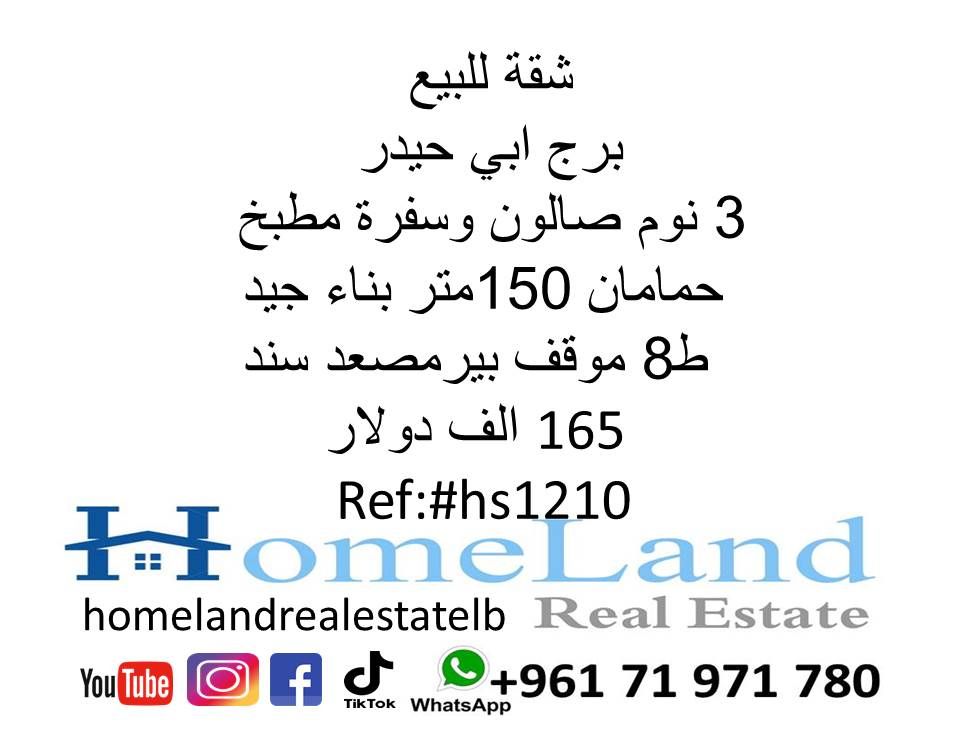 شقة للبيع برج أبي حيدر 3 نوم صالون وسفرة مطبخ وحمامان 150 متر بناء جيد ط 8 موقف بئر مصعد سند 165 ألف دولار مكتب عقاري للتواصل تلفون