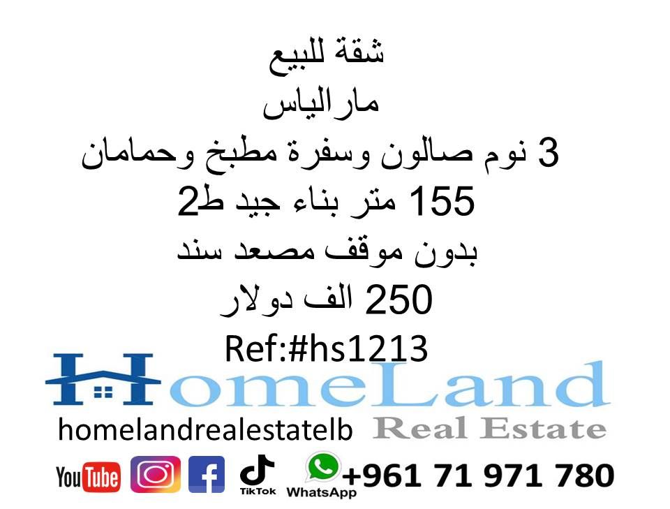 شقة للبيع مار الياس 3 نوم صالون وسفرة مطبخ وحمامان 155 متر بناء جيد ط 2 بدون موقف مصعد سند 250 ألف دولار مكتب عقاري للتواصل تلفون