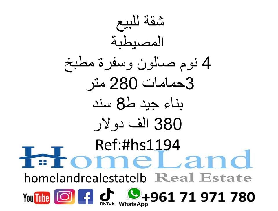 شقة للبيع المصيطبة 4 نوم صالون وسفرة مطبخ و3 حمامات 280 متر بناء جيد ط 8 سند 380 ألف دولار مكتب عقاري للتواصل تلفون