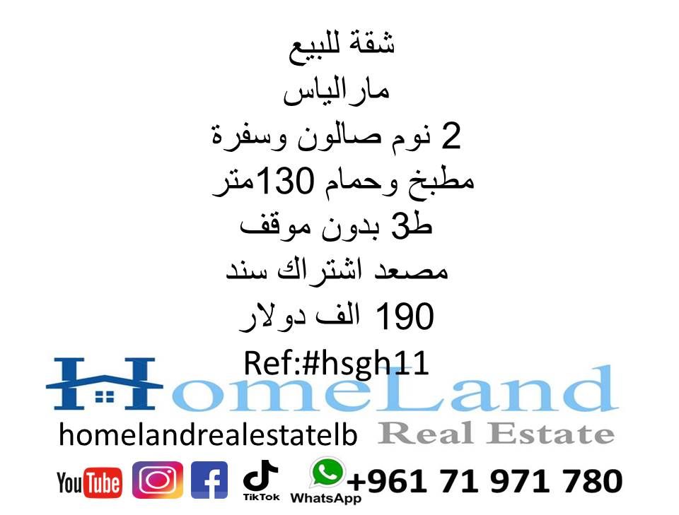 شقة للبيع مار الياس 2 نوم صالون وسفرة مطبخ وحمام 130 متر ط 3 بدون موقف مصعد اشتراك سند 190 ألف دولار مكتب عقاري للتواصل تلفون