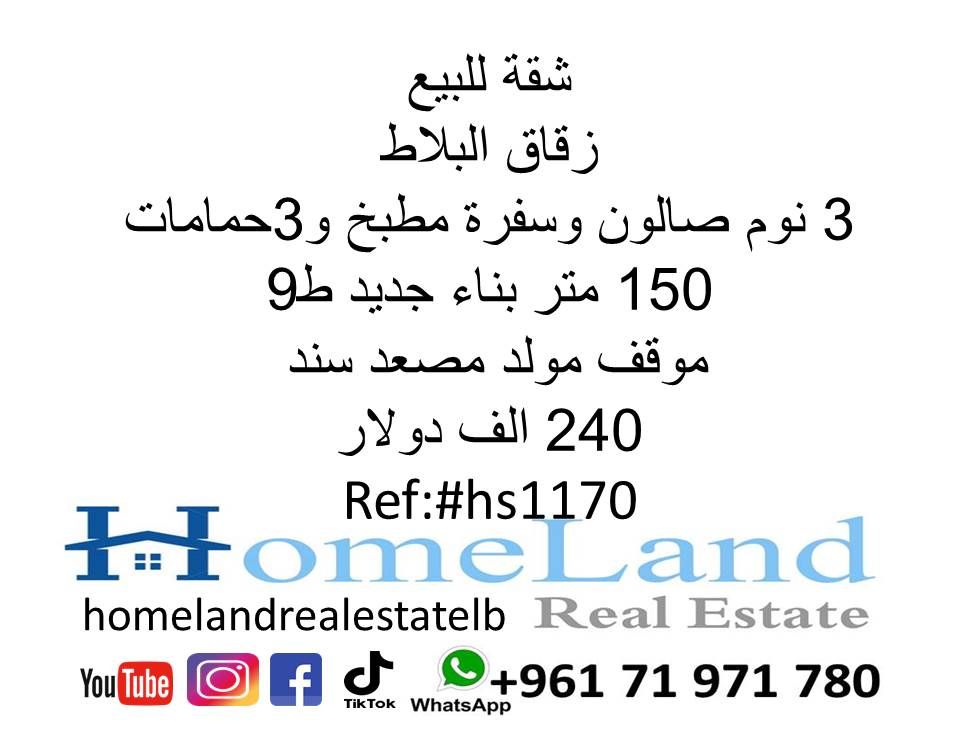 شقة للبيع زقاق البلاط 3 نوم صالون وسفرة مطبخ و3 حمامات 150 متر بناء جديد ط 9 موقف مولد مصعد سند 240 ألف دولار مكتب عقاري للتواصل تلفون