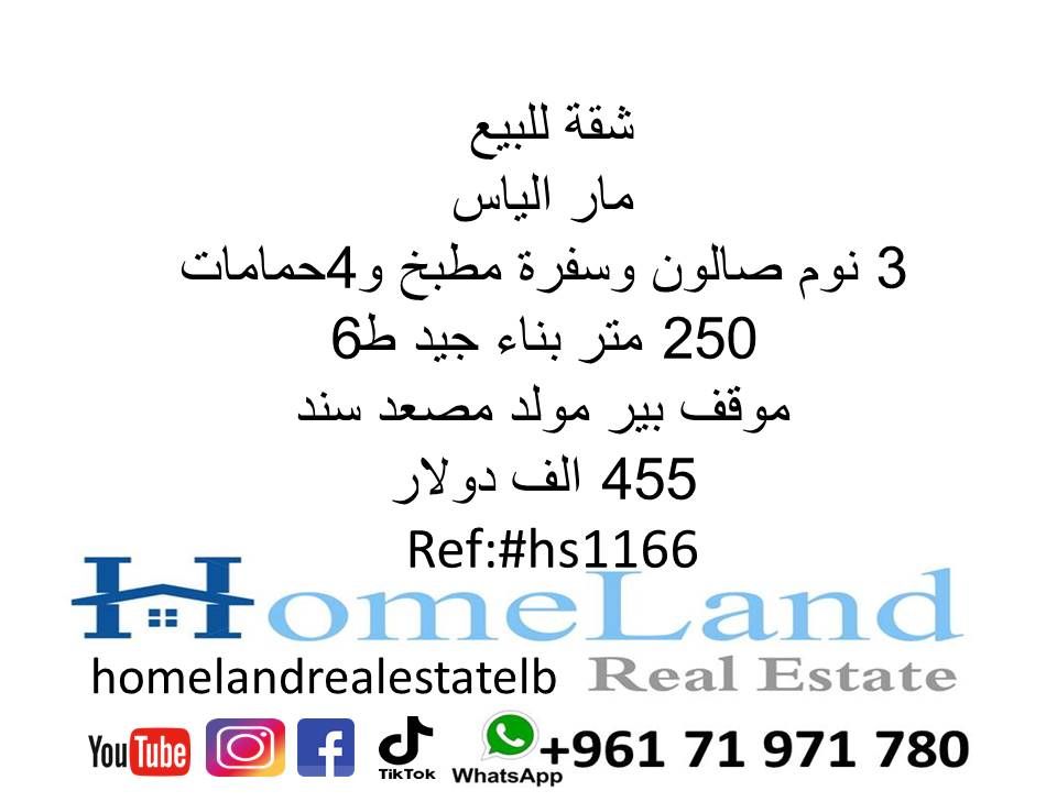 شقة للبيع مار الياس 3 نوم صالون وسفرة مطبخ و4 حمامات 250 متر بناء جيد ط 6 موقف بئر مولد مصعد سند 455 ألف دولار مكتب عقاري للتواصل تلفون
