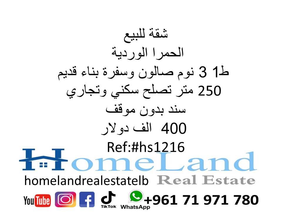 شقة للبيع الحمرا الوردية 3 نوم صالون وسفرة ط 1 250 متر دون موقف سند 400 ألف دولار مكتب عقاري للتواصل