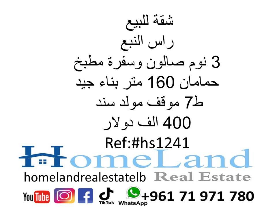 شقة للبيع راس النبع 3 نوم صالون وسفرة مطبخ وحمامان 160 متر بناء جيد ط 7 موقف مولد سند 400 ألف دولار مكتب عقاري للتواصل تلفون