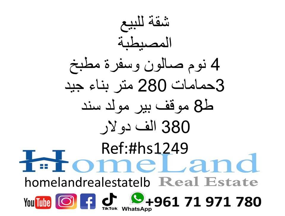 شقة للبيع المصيطبة 4 نوم صالون وسفرة مطبخ و3 حمامات 280 متر بناء جيد ط 8 موقف بئر مولد سند 380 ألف دولار مكتب عقاري للتواصل تلفون