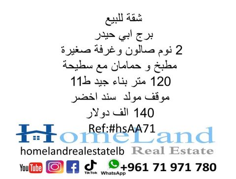 شقة للبيع برج أبي حيدر 2 نوم صالون وغرفة صغيرة مطبخ وحمامان مع سطيحة 120 متر بناء جيد ط 11 موقف مولد سند أخضر 140 ألف دولار مكتب عقاري للتواصل تلفون