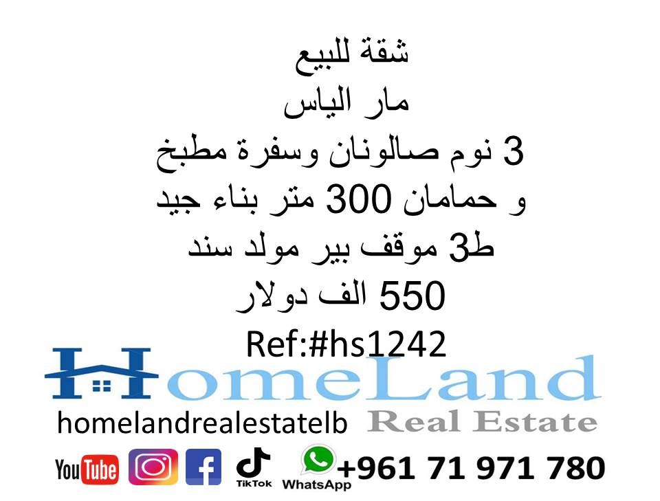 شقة للبيع مار الياس 3 نوم صالونان وسفرة مطبخ وحمامان 300 متر بناء جيد ط 3 موقف بئر مولد سند 550 ألف دولار مكتب عقاري للتواصل تلفون