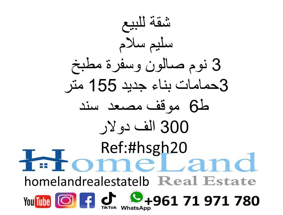 شقة للبيع سليم سلام 3 نوم صالون وسفرة مطبخ و3 حمامات 155 متر بناء جديد ط 6 موقف مصعد سند 300 ألف دولار مكتب عقاري للتواصل تلفون