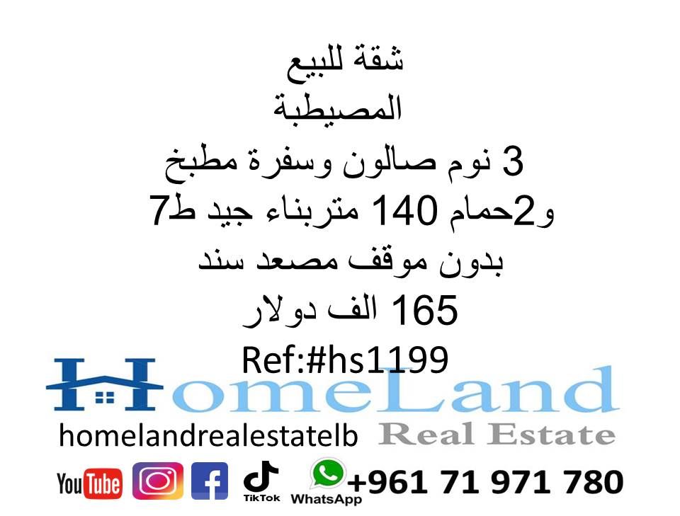 شقة للبيع المصيطبة 3 نوم صالون وسفرة مطبخ و2 حمام 140 متر بناء جيد ط 7 بدون موقف مصعد سند 165 ألف دولار مكتب عقاري للتواصل تلفون