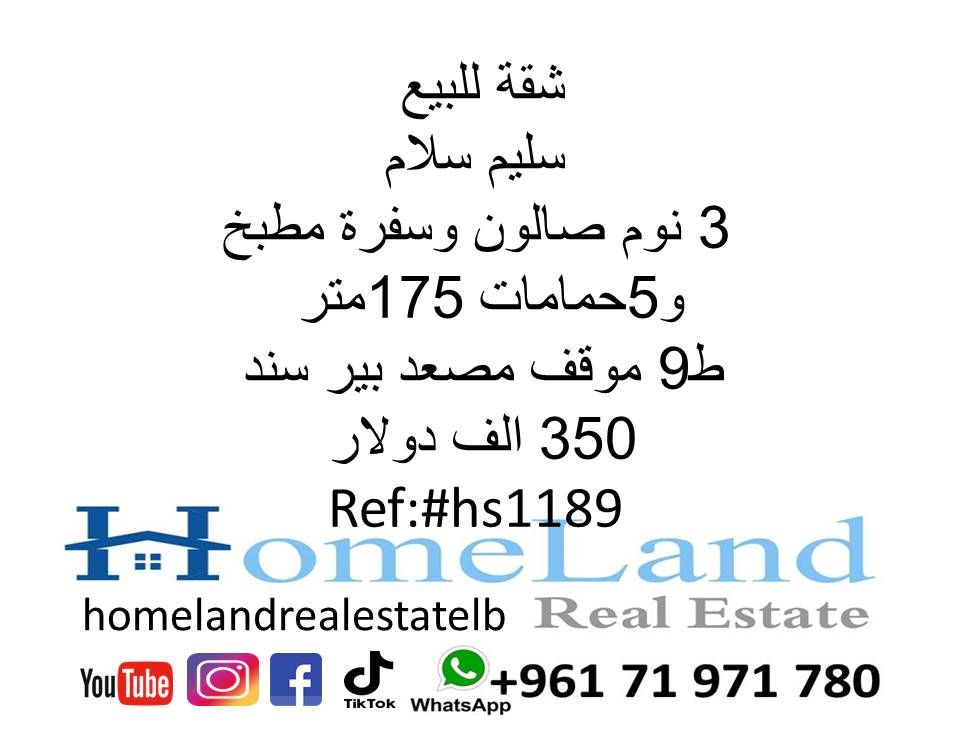 شقة للبيع سليم سلام 3 نوم صالون وسفرة مطبخ و5 حمامات 175 متر ط 9 موقف مصعد بئر سند 350 ألف دولار مكتب عقاري للتواصل تلفون